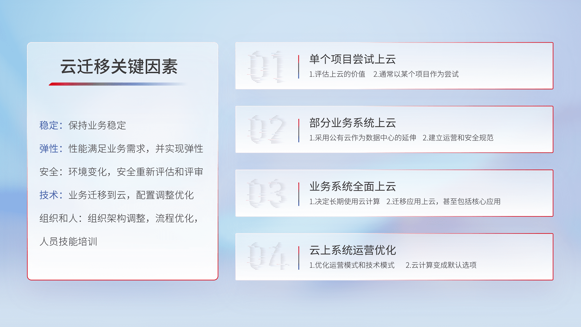 结合实际业务,,,从规划设计、、、、云平台选型、、、云原生改造、、、、数据迁移、、、集成交付,,,,迁移全过程为客户识别最佳上云路径,,,,做好风险识别管理,,,,设计网络架构、、、、身份权限、、、安全审计合规、、、操作审计、、、、日志审计、、、监控告警策略、、、多站点容灾设计等,,,对云上基础设施进行整体规划,,,,提升IT治理水平,,,,以满足弹性、、高可用、、、、高性能的需求。。