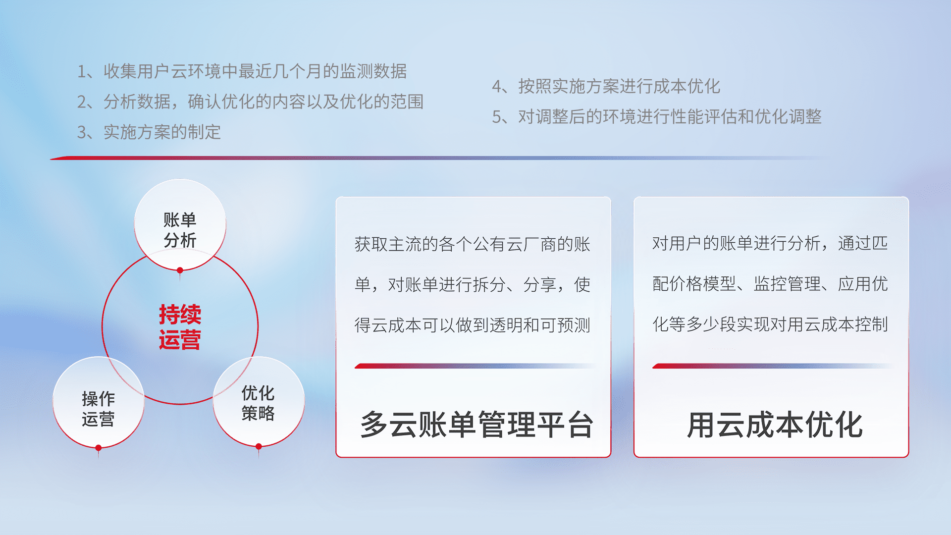通过多云纳管,,以统一的资源数据模型把客户的云资源进行抽象和封装,,,进而实现对多云资源的统一操作,,保障云资源管理的可靠性、、、稳定性与可用性。。。量身定制化运维内容,,配置、、开发运维、、、、补丁管理、、、备份、、、监控、、认证和访问管理、、、、审计和日常巡检等,,保障在用云过程中的可靠度,,稳定度以及高可用率。。。